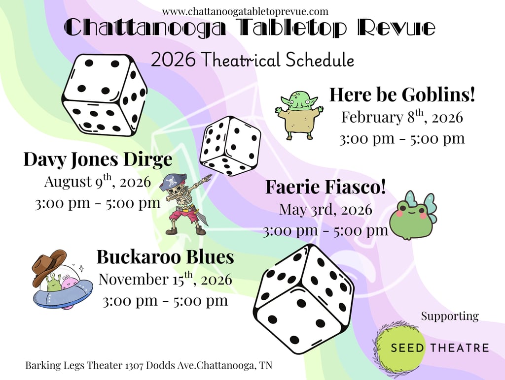 We are looking into our local cons as well. Chattanooga Comic Con was such a blast, we want to do it again! If you enjoyed the Improv Workshops or live Actual plays, let us know! Drop us an email, join the discord, send a carrier pigeon. All our great options.